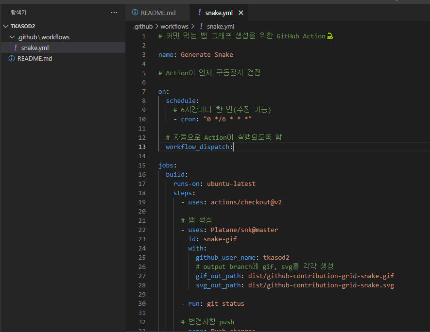 참고 내용 출처 : https://6h15m.github.io/github/readme/2021/07/20/github-snake.html